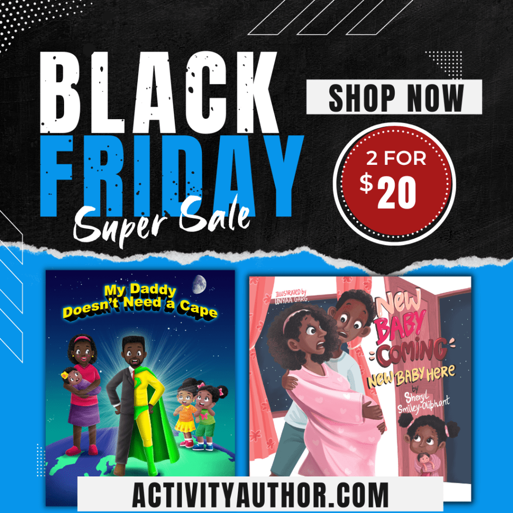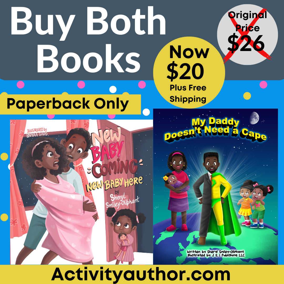 You will receive 1 autographed paperback copies of My Daddy Doesn’t Need a Cape (size 8 x 10) & New Baby Coming, New Baby Here (size 10 x 10) , coloring sheets, and a surprise treat for your child. You also receive FREE SHIPPING with every order!!!