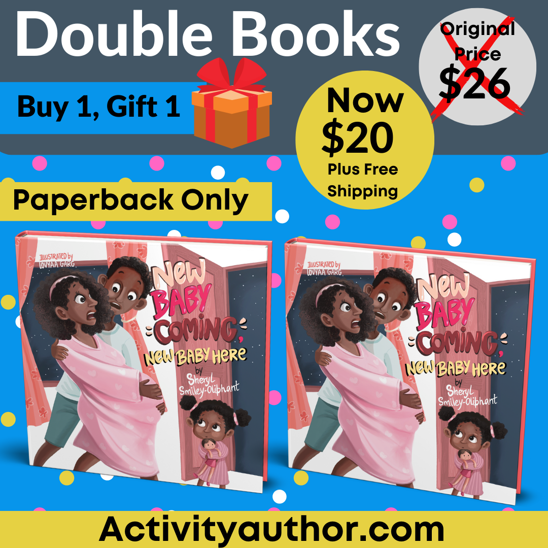 You will receive 2 autographed paperback copies of New Baby Coming, New Baby Here (size 10 x 10), coloring sheets, and a surprise treat for your child. You also receive FREE SHIPPING with every order!!!