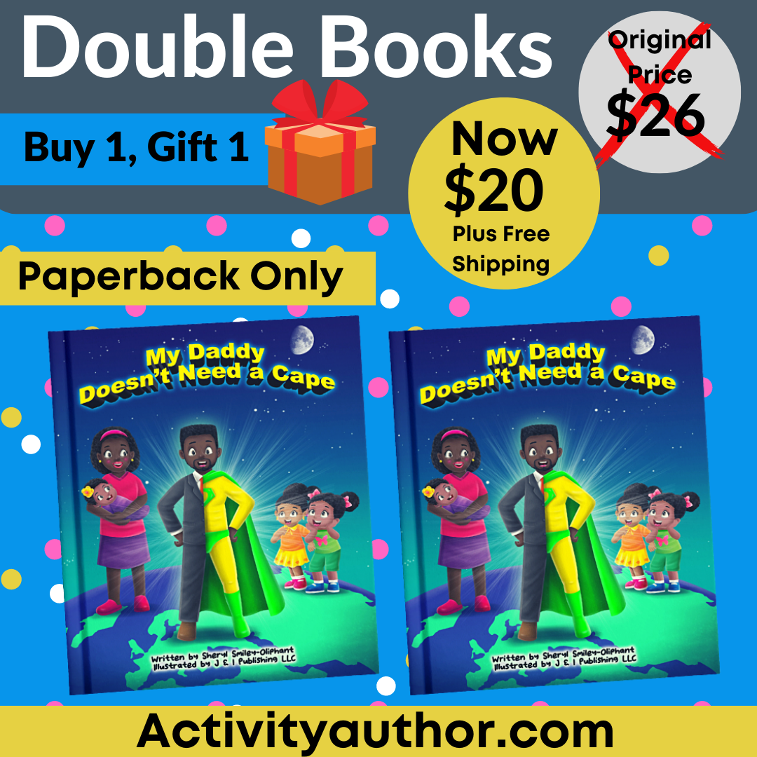 You will receive 2 autographed paperback copies of My Daddy Doesn’t Need a Cape(size 8 x 10), coloring sheets, and a surprise treat for your child. You also receive FREE SHIPPING with every order!!!